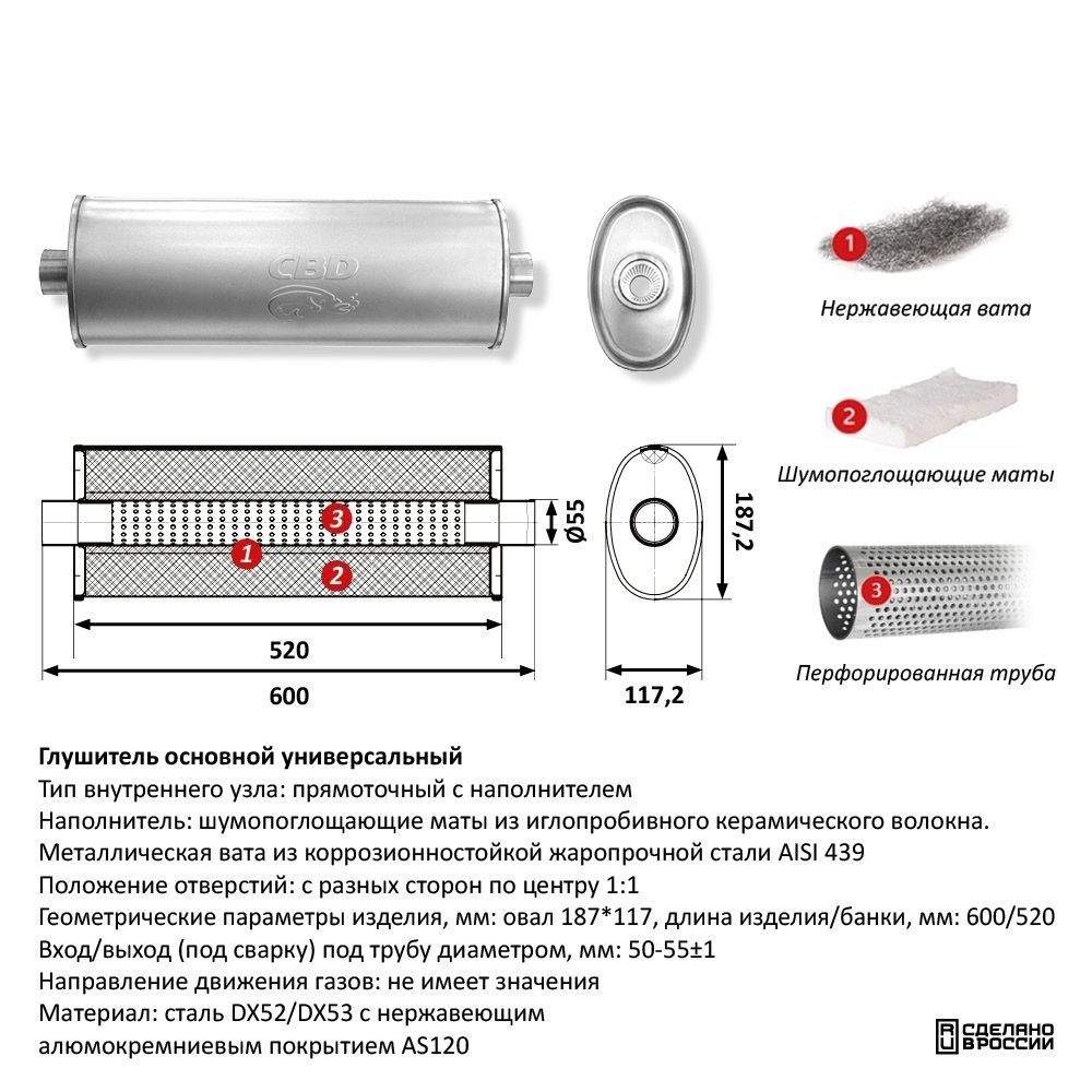 Наполнитель: Шумопоглощающие маты из иглопробивного керамического волокна. Металлическая вата из коррозионностойкой жаропрочной стали AISI 439