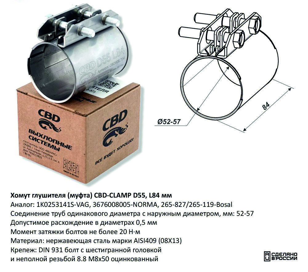 Спецификация: Хомут для соединения выпускных труб одного диаметра, момент затяжки болтов не более 20 Н·м