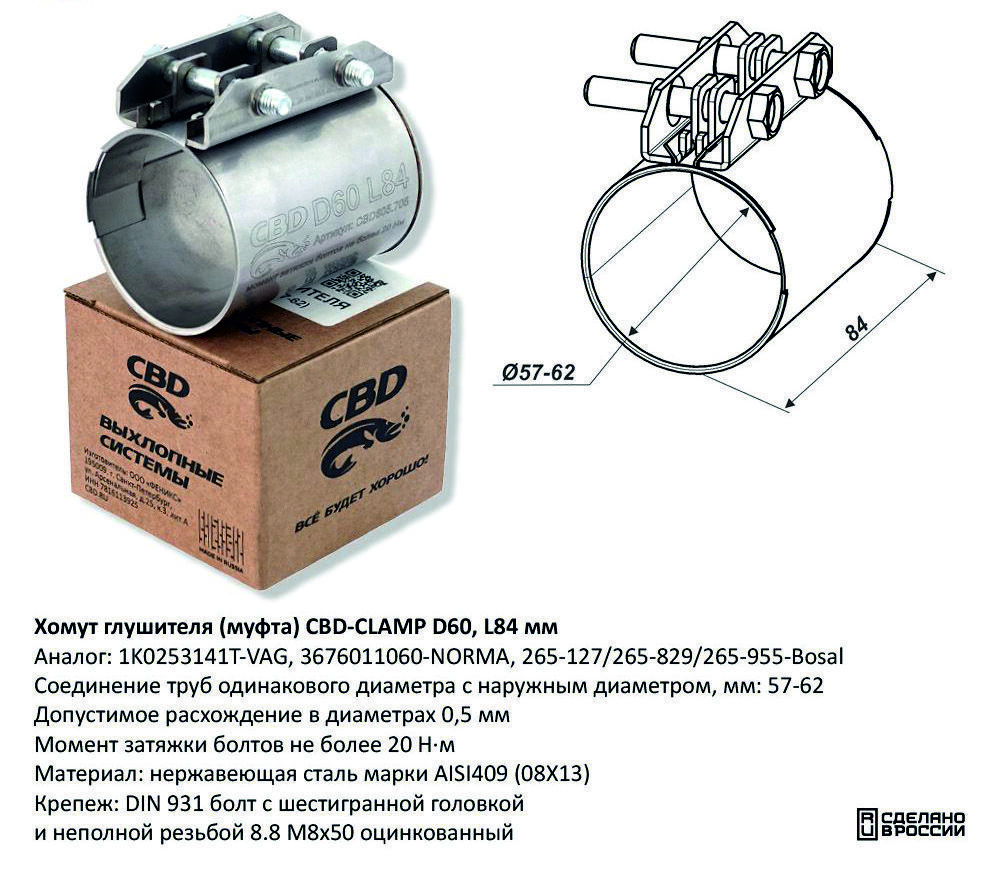 Спецификация: Хомут для соединения выпускных труб одного диаметра, момент затяжки болтов не более 20 Н·м