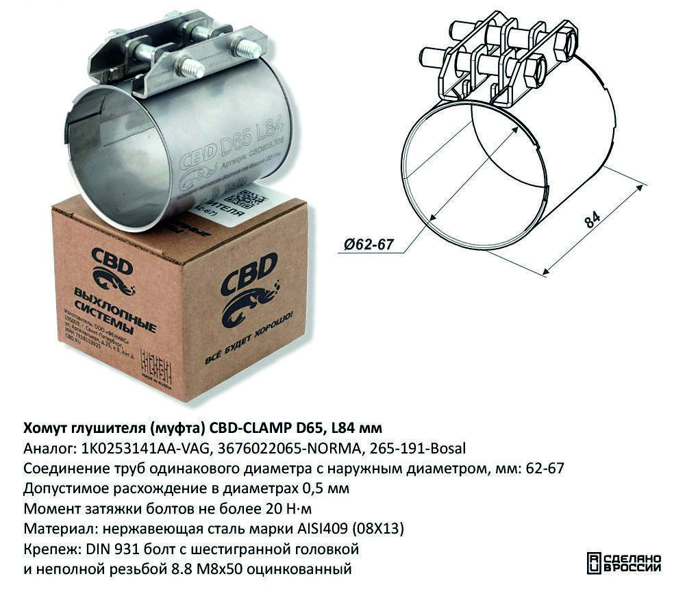 Спецификация: Хомут для соединения выпускных труб одного диаметра, момент затяжки болтов не более 20 Н·м