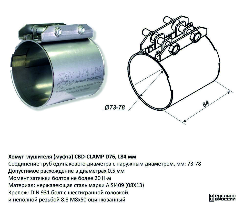 Спецификация: Хомут для соединения выпускных труб одного диаметра, момент затяжки болтов не более 20 Н·м