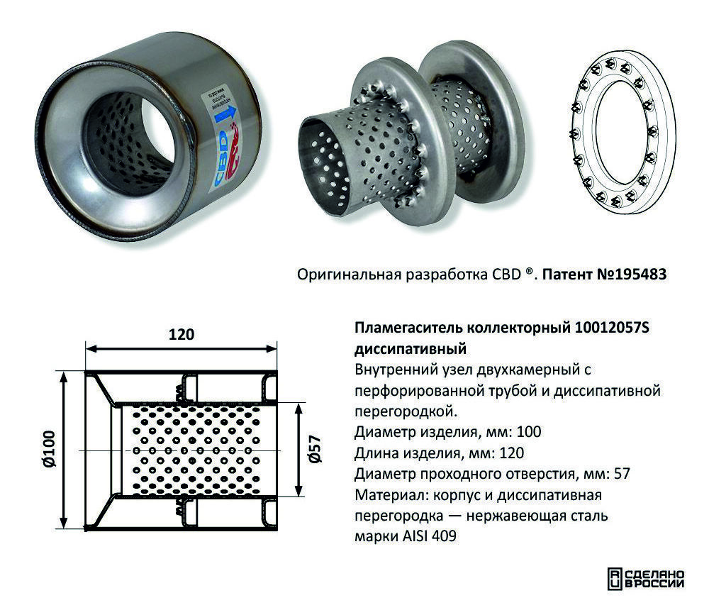 Материал: Корпус и диссипативная перегородка — нержавеющая сталь марки AISI 409. Перфорированная труба — сталь DX52/DX53 с нержавеющим алюмокремниевым покрытием AS120