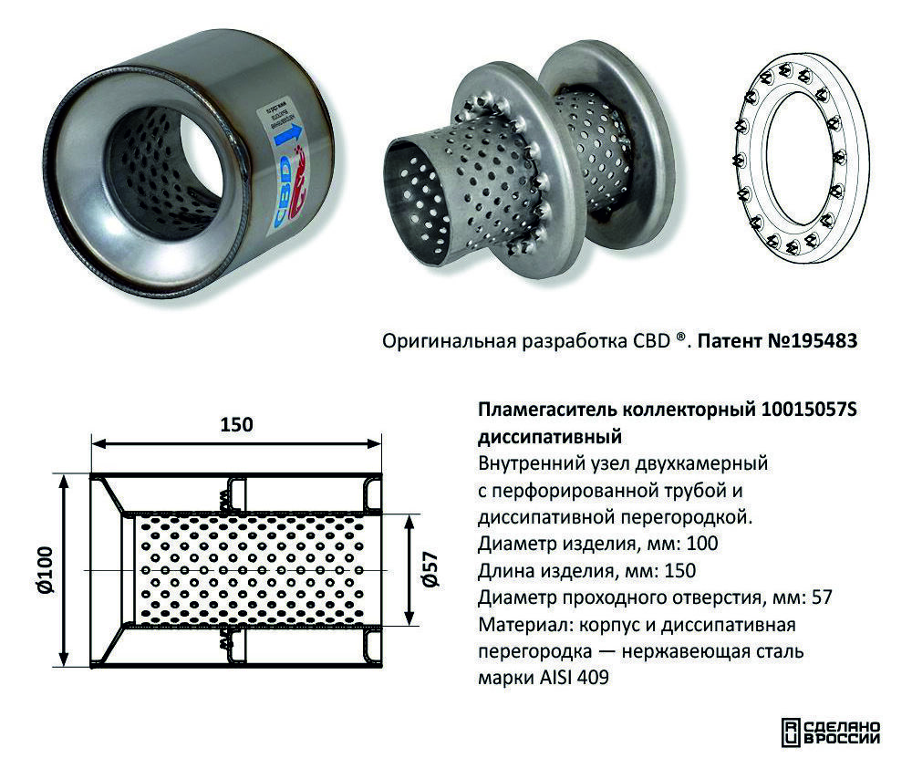 Материал: Корпус и диссипативная перегородка — нержавеющая сталь марки AISI 409. Перфорированная труба — сталь DX52/DX53 с нержавеющим алюмокремниевым покрытием AS120