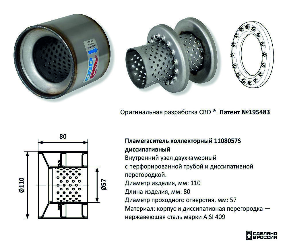 Материал: Корпус и диссипативная перегородка — нержавеющая сталь марки AISI 409. Перфорированная труба — сталь DX52/DX53 с нержавеющим алюмокремниевым покрытием AS120