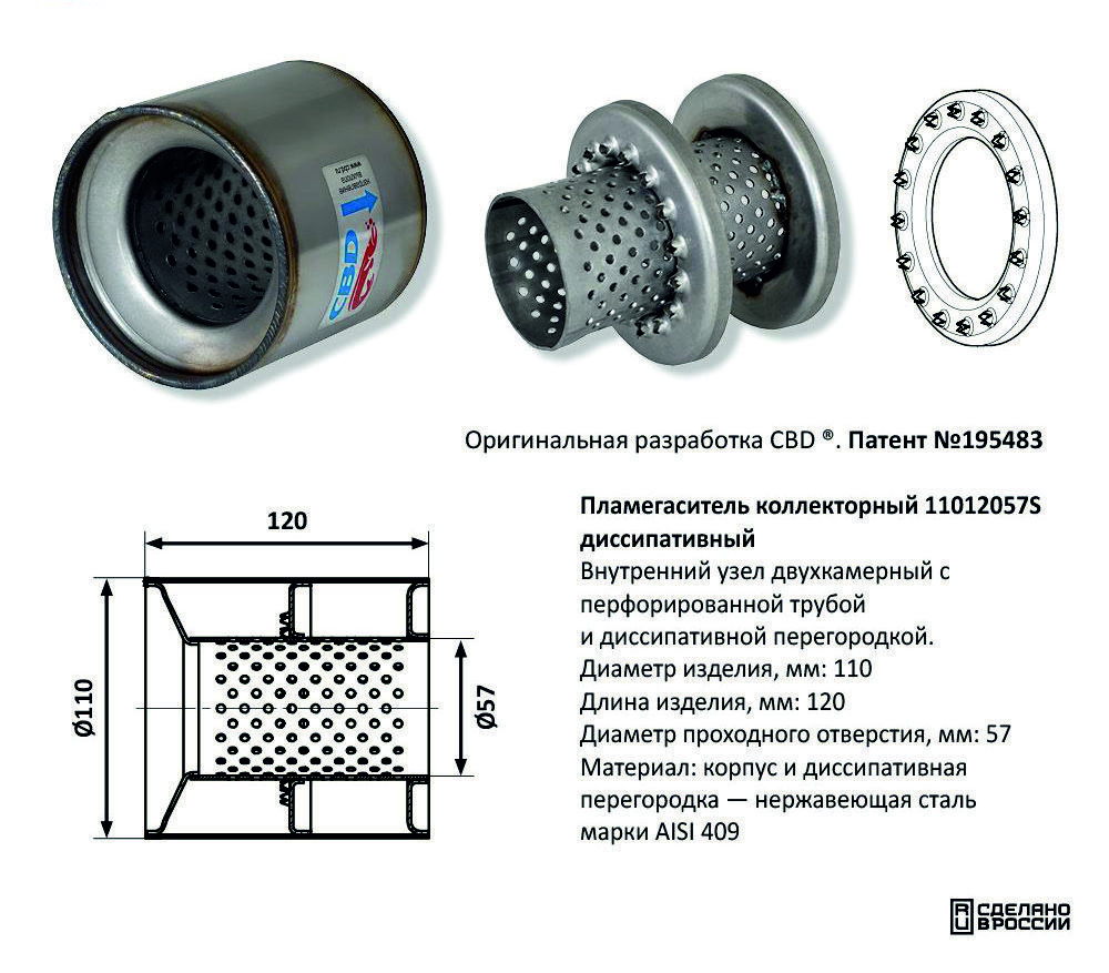 Материал: Корпус и диссипативная перегородка — нержавеющая сталь марки AISI 409. Перфорированная труба — сталь DX52/DX53 с нержавеющим алюмокремниевым покрытием AS120