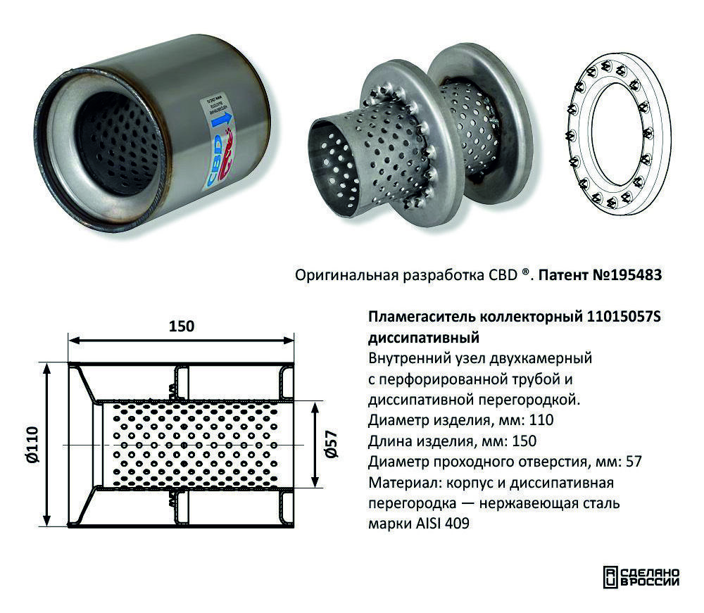 Материал: Корпус и диссипативная перегородка — нержавеющая сталь марки AISI 409. Перфорированная труба — сталь DX52/DX53 с нержавеющим алюмокремниевым покрытием AS120