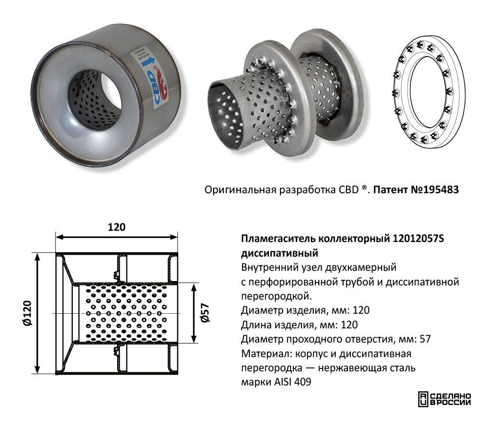 Материал: Корпус и диссипативная перегородка — нержавеющая сталь марки AISI 409. Перфорированная труба — сталь DX52/DX53 с нержавеющим алюмокремниевым покрытием AS120